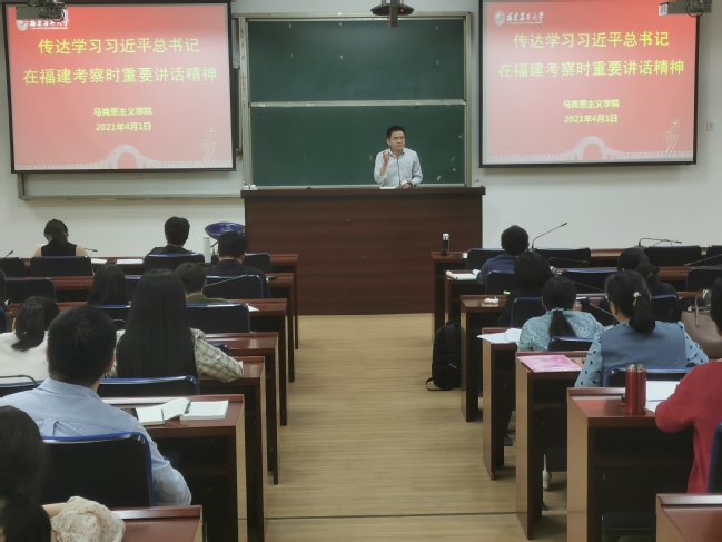 4月1日下午,马克思主义学院在禧强楼206开会传达学习习近平总书记在福建考察时的重要讲话精神,会议由学院党委书记雷国铨主持,全体教职工和学生党员参加了会议。